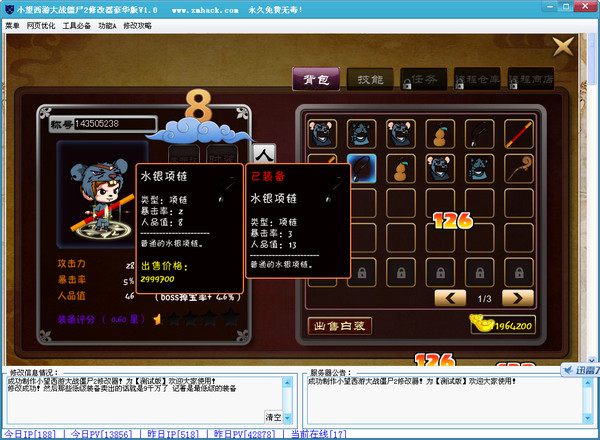 西游大战僵尸2修改器至于怎么改所有装备的值,首先我们要看看这个装备的价格是多少钱不如我这个准备买的钱是2400 我4字搜2400 然后把搜索的值改为999999 你在把装备卸下来看看是不是价格变成是999999了,然后我们在排除,搜到的值中只有一个是真的,我们排除方法很简单,首先是把一半的值改为2400然后看装备变成2400没,变了就这一半里面有着个值,没变就代表没有,然后在一半的一半里面排除,反正排除到最后一个值,就是他了,然后用他的地址搜索,比如我的值是0011E3EC当然你们搜到的值的地址和我不一样··我们在内存扫描里第一个空改为0011E000第2个改为0011Efff我没在搜索你的要改的装备的属性,比如我的武器的攻击是12对吧,我 4字搜12然后改成9999,你在看你背包的武器,你会发现攻击没变,然后你改的装备上去看看,哈哈人物攻击变了!~别忘了保存哦。