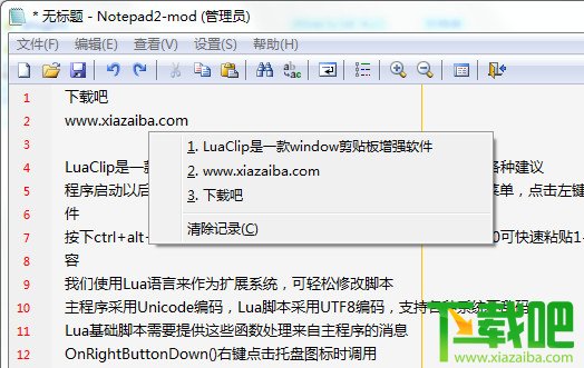 LuaClip是一款Window剪贴板增强软件,可以把经常要粘贴的内容保存下来,想要粘贴时按下快捷键即可粘贴。程序启动以后会在任务栏通知区域显示一个图标,点击右键可弹出菜单,点击左键可临时禁用软件。按下Ctrl+Alt+V可在光标位置弹出快捷粘贴菜单,使用Ctrl+1 - Ctrl+0 可快速粘贴1-10号剪贴板内容。