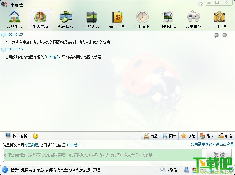 下载吧提供小麻雀多功能生活助手官方版,小麻雀多功能生活助手界面清新简洁友好,用户能在较短的时间内掌握软件的使用。小麻雀多功能生活助手功能包括:生活导航(天气预报、节日提醒、地理位置、上网导航等);购物广场(免费提供摊位来放置自己的物品、可定制自己的街区、免费网盘、好友聊天、摊位聊天、地区聊天等);影音播放(提供音乐、电影播放功能,支持在线下载、播放网络媒体资源);每日记账(特点:记录每日的收入和支出,让自己合理消费,支持统计查询);便捷闹钟(定时提醒、启动、关机、重启、待机、注销、休眠、锁定等);实用工具(常用的生活小工具箱);我的壁纸(提供适合您桌面的壁纸,支持自动切换)等。