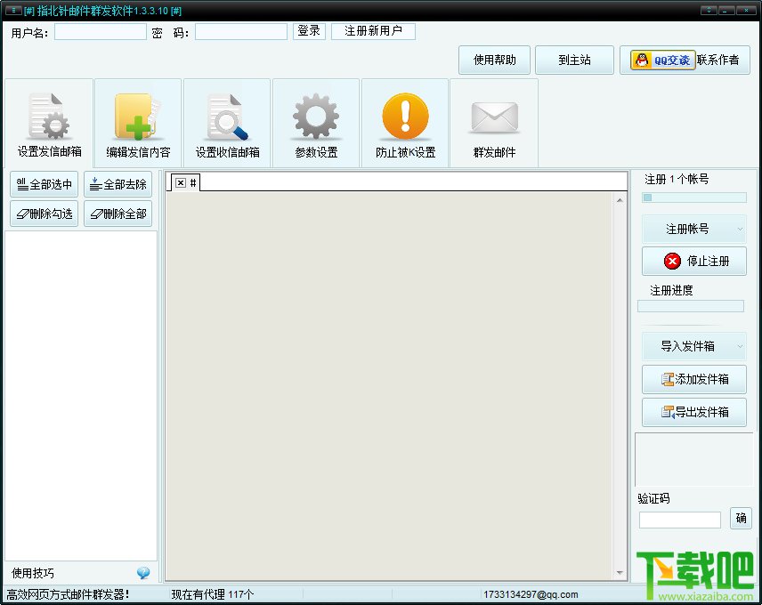 8.24 MB/2020-08-17下载吧提供指北针邮件群发软件是一款可以自动搜索无穷多qq邮箱的邮件群发工具,支持网页方式和smtp2种主流发送方式,成功率高、智能快捷、安全高效,多种混淆方式,保证邮件的到达率,是上网者不可多得的推广利器。
