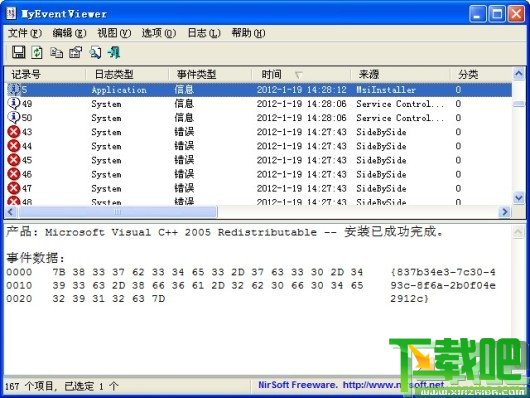 下载吧提供的MyEventViewer是一个简单的小工具,可以用于替代标准的Windows事件查看器。相对Windows事件查看器来说,MyEventViewer允许你查看事件列表中的多个事件,以及在主窗口中会显示事件的描述和数据,而不用打开一个新窗口才能查看。此外,使用它您可以轻松地选择多个项目,然后将它们保存到网页/文字/ XML文件,或将它们复制到剪贴板中(Ctrl + C键),然后将他们粘贴到Excel。