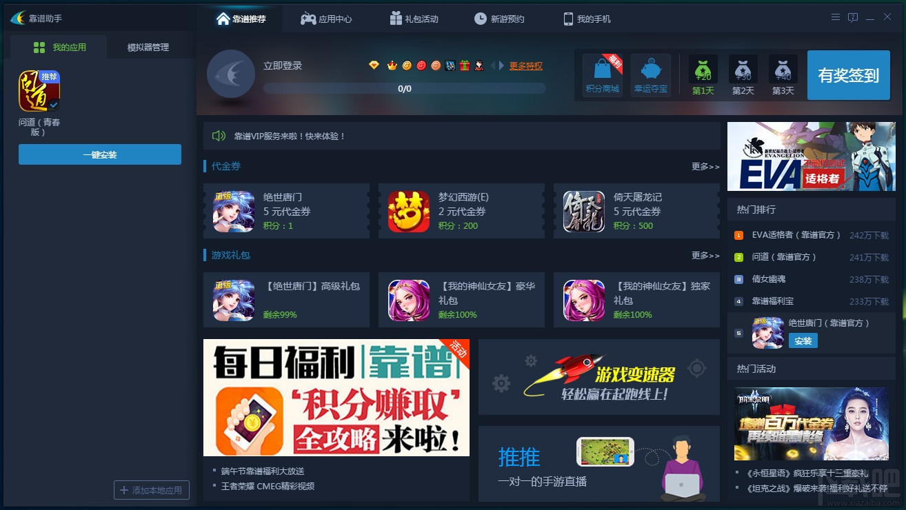 靠谱助手,让您享受电脑运行手游!无数款安卓游戏与应用供您下载,每天推荐最火热的应用和较好玩的游戏,让您轻松成为时尚的玩机达人。 安装靠谱助手助手,瞬间下软件,畅玩编辑精选游戏,随时管理软件!