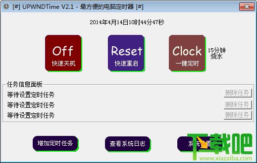 下载吧提供的upwndtime支持定时关机、重启、闹钟,也支持超远程关机、重启、闹钟;upwnd系列软件均采用绿色编程不需安装即可执行。