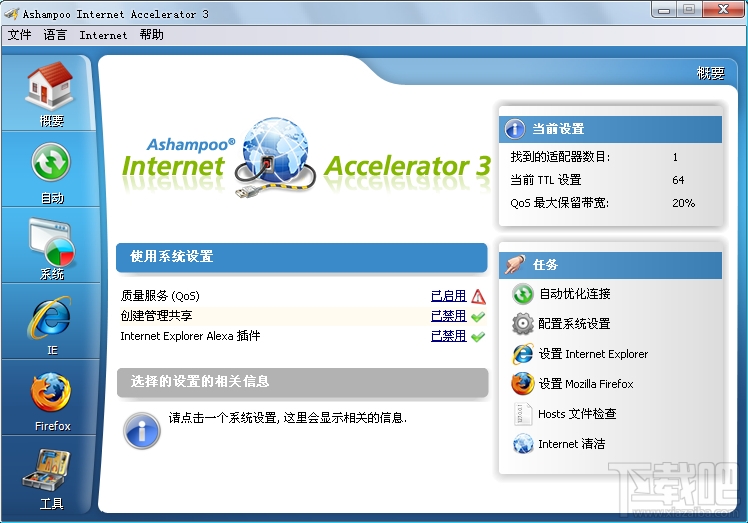 Ashampoo Internet Accelerator可对计算机进行分析,并一键式优化所有相关设置。您无需学习任何专业知识,只需选择自动优化工具即可。新版本还提供互联网连接速度测试工具,从而您可以直接测试性能。
