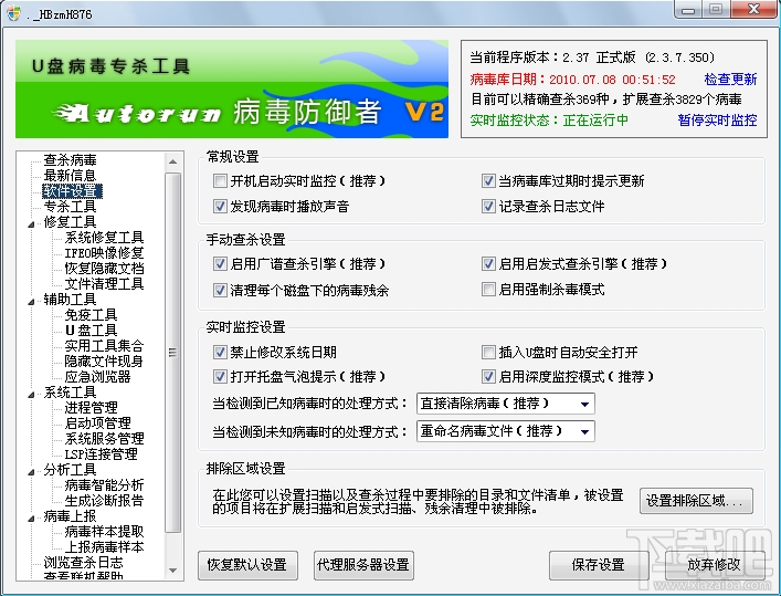 此外,Autorun病毒防御者还有U盘病毒免疫、系统修复、残余清理、病毒分析、系统诊断、顽固目录删除、应急浏览器、隐藏文档恢复、隐藏目录恢复、U盘解锁、U盘软件写保护等一系列完整的辅助工具,以及进程管理、启动项管理和系统服务管理等系统工具,能够让您彻底远离U盘病毒的困扰。