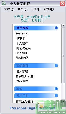 实创个人数字助理个人数字助理是一款功能强大的个人信息管理平台,集计划任务、记事本、个人理财、网址收藏、名片管理、相册管理、邮件发送、邮编区号查询、手机号码所在地查询、NT信息服务、个人所得税计算、万年历查询等众多功能于一身,界面美观,操作简单,功能实用,数据安全,使用本软件可使您的工作、生活更加轻松。