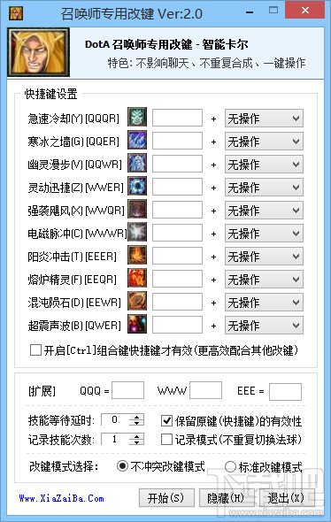 卡尔召唤师改键KaelKey去广告绿色版是一款魔兽DotA召唤师卡尔专用的改键工具。DotA召唤师专用改键(KaelKey) 能让您更好的操控N多技能的卡尔,强大的一键操作放飞你的双手。而且此专用改键还加入了 加加魔兽助手 和 WarKey++ 的改键不影响聊天的智能判定。