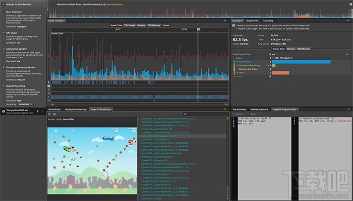 下载吧提供的Adobe Scout CC 2014官方简体中文版是Adobe公司发布的一款一个重量级工具,主要用于分析swf运行资源占用情况,定位瓶颈的软件。Adobe Scout是一个内存概要分析工具,可以对ActionScript应用程序(桌面上运行的Flash Player)以及在Adobe AIR上运行的移动设备应用程序进行概要分析。