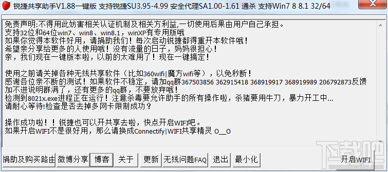 现在大学不少都要用锐捷客户端进行上网验证,使到有一些人不能使用多网卡。下载吧提供的锐捷共享助手就是为此而生的,锐捷共享助手绿色版主要就是解除锐捷客户端不让多网卡这个限制,解除之后,我们就可以通过无线共享软件给手机、平板、笔记本等无线设备上上网、发发微博、听听歌等等。