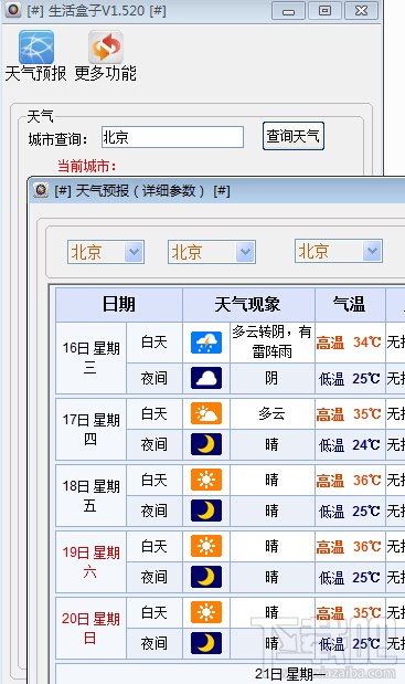 您只需要输入相应的城市一键点击查询天气即可显示今、明、后天的天气,点击详细参数还可以显示湿度,空气质量等详细信息