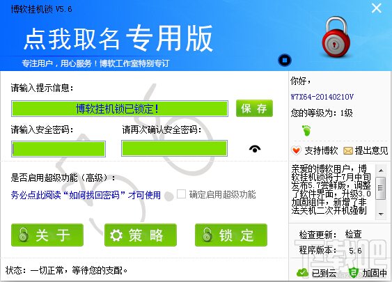2014年4月03日V5.2:首次加入“云概念”。新增“超级功能”在线即时人工找回密码。密码安全有保障;另新增锁屏计时,知晓锁屏每分每秒;启用人性化昵称,开启轻松问候;融入微博、QQ空间等各大分享平台,分享小伙伴让其加入,体验锁屏乐趣;在线即时反馈功能让我们更好成长;博软挂机锁5.2云概念版可以说是一个颠覆性版本。越来越人性化。博软挂机锁,更懂你!