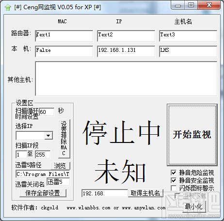 蹭网监视器使用说明:打开软件,点“开始监视”就可以了,“危险”说明有主机在网内,但是不是网主就不知道了,“安全”说明网内就你一个人再用,看电影下载,随便玩。把“静音监视”前的勾取消掉再开始监视,有主机上线了会自动声音报警。开始监视后,点最小化,软件就会后台,运行了。可以放心玩了,主机来了,会报警了。主机上线限制下载的话,暂时只支持迅雷5,勾“监视下载”后开始监视,显示“安全”就开启迅雷5,请设置迅雷5为启动,自动开始下载,显示“危险”后就会关闭迅雷5