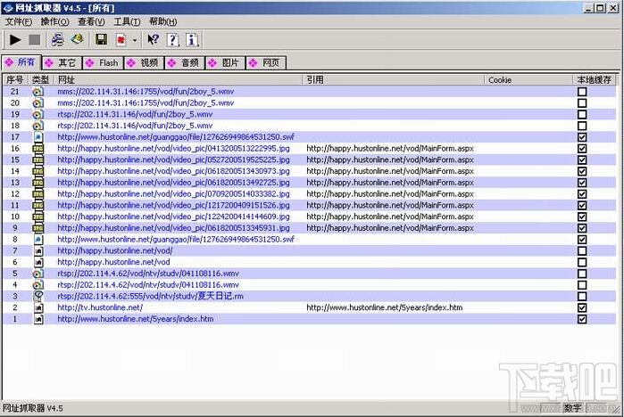 HTTP网址抓取器(URLCapturer)能够抓取到网址、网址引用、Cookie、是否有本地缓存等信息。提供对各种资源URL进行分门别类,可自定义扩展名过滤,提供方便的操作在各类别之间切换。由于很多资源在你的浏览时就被下载到本地临时文件夹,本软件对这些已经在本地有缓存的文件提供快速保存,不需要再从网上下载。另外,对于本地没有缓存的资源,可以使用网际快车等下载工具下载,下载工具可以自行定义。本软件还可将抓取的结果分类导出,保存到硬盘。