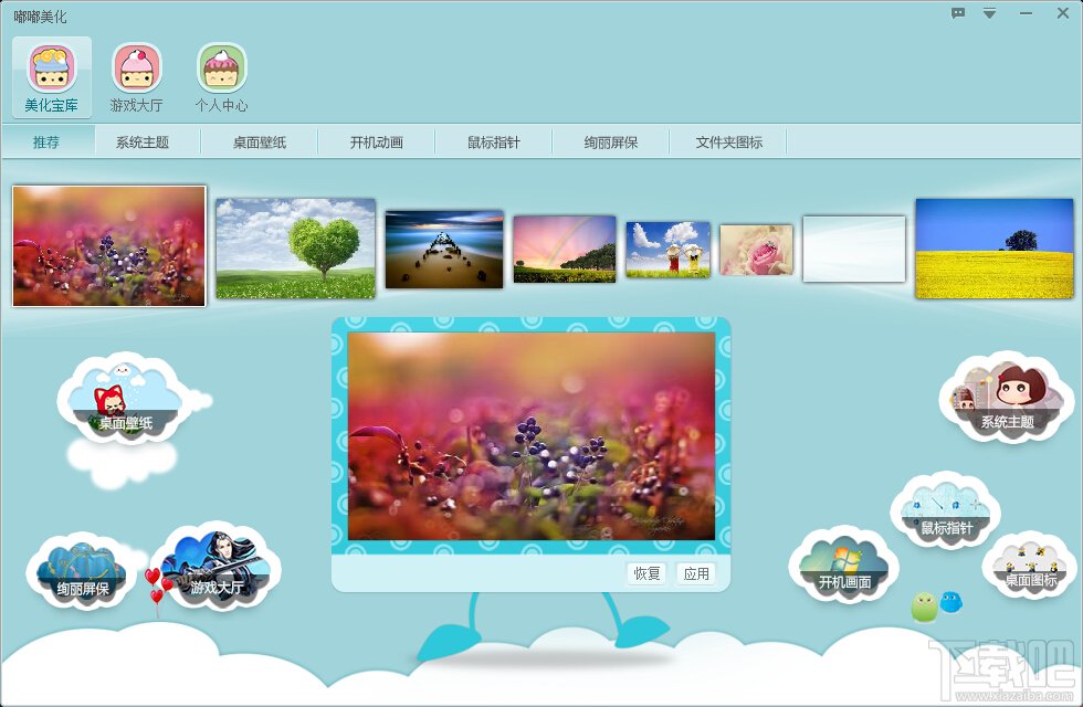 桌面壁纸、绚丽屏保、美图分享、系统主题、鼠标指针、开机画面、桌面图标