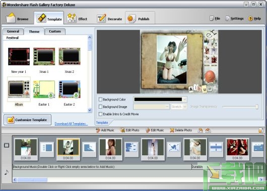 Flash Slideshow Builder 模式下,支持将Flash幻灯相册发布为多种格式,包括:SWF Movie、XML、HTML、可执行文件、屏保程序等,而 Flash Gallery Builder 模式则支持发布为Flash文件;目前新版 Flash Gallery Factory 自带了一个Flash相册模版创建器:Template Designer for Slideshow Mode,其独特的Flash相册模板编辑功能让你打造随心所欲的华丽相册。