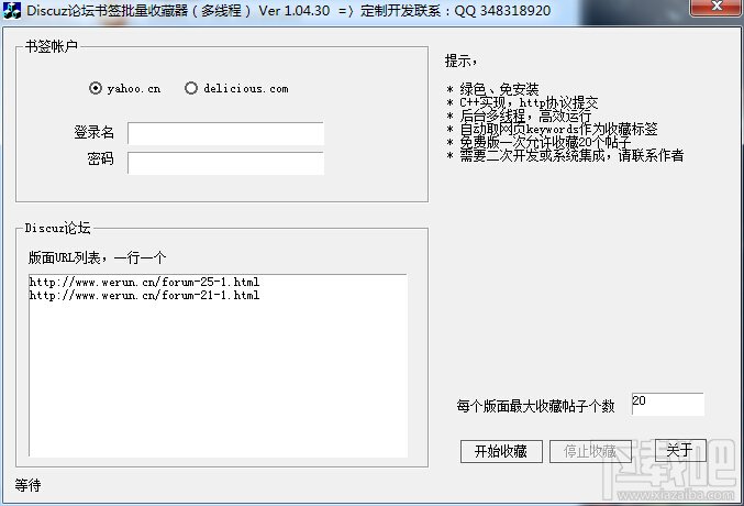Discuz论坛书签批量收藏器可批量把Discuz论坛帖子添加到雅虎收藏,提高搜索引擎收录。Discuz论坛书签批量收藏器绿色、免安装;Discuz论坛书签批量收藏器是用C++实现,http协议提交;Discuz论坛书签批量收藏器后台多线程,高效运行;Discuz论坛书签批量收藏器自动取网页keywords作为收藏标签。