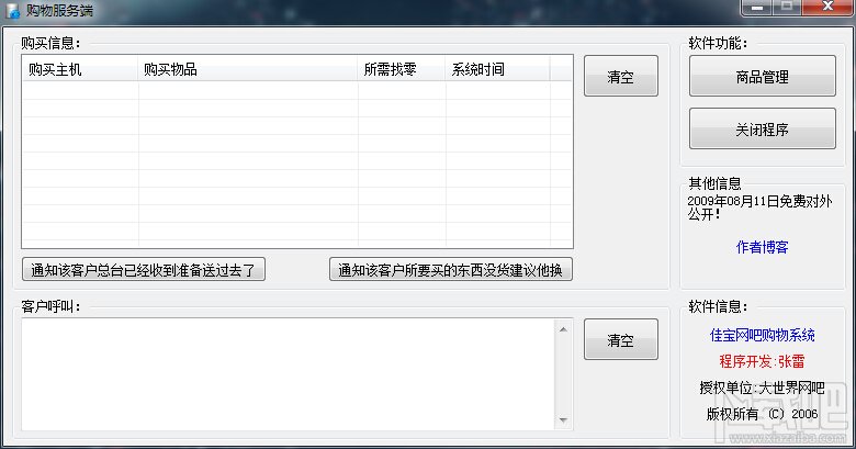 佳宝网吧购物系统是一款可以在网吧里使用的购物系统,非常方便网吧客户和网管。佳宝网吧购物系统是基于C/S构架,服务端使用Access数据库,通过发包传输在服务端数据库中的商品信息,对方(客户)是没有任何商品信息的,这样有效防止了部分垃圾客人。