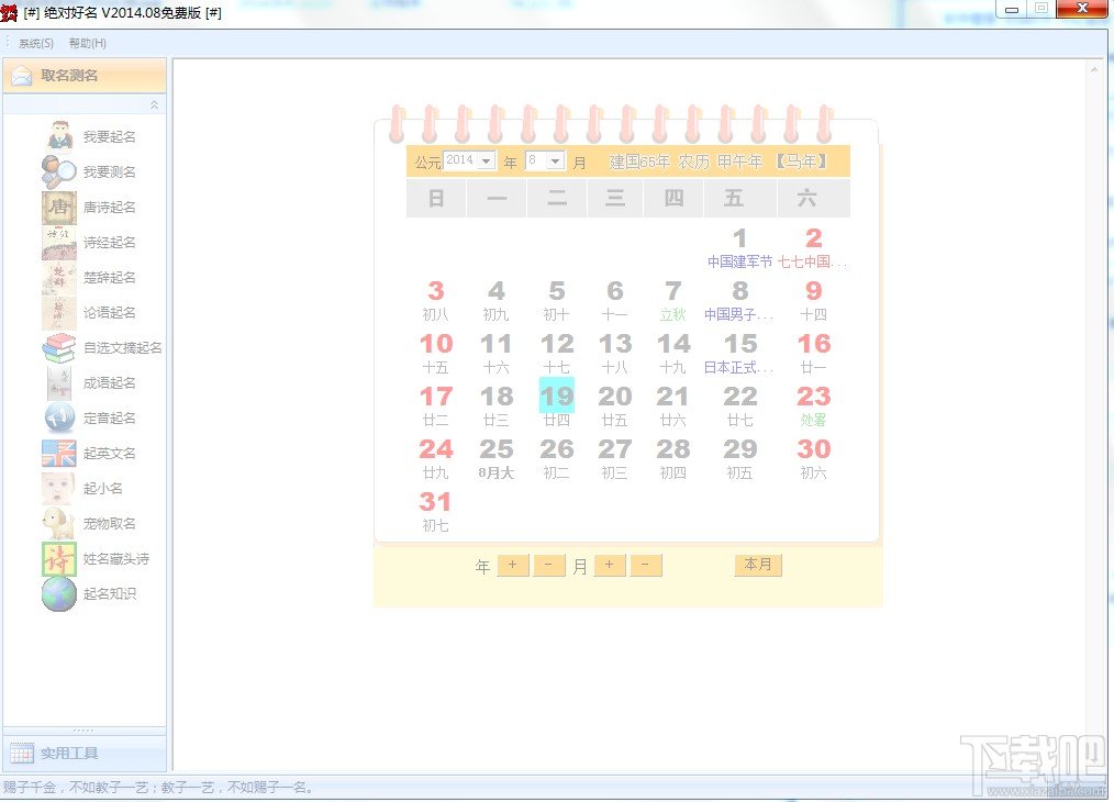 8.7 MB/2020-08-17高分五行生辰八字宝宝取名软件免费版是一款起名工具,软件有多种起名模式可以选择,有经典起名,高分五行起名,组名起名,小名起名等等。软件参照姓名学原理、八字、喜用神、名字吉凶、字辈、名字长度、文武、字型、音律、意义、美学、形象、起名心理学、起名禁忌、生肖、签名书写、天格、地格、人格、外格、总格、三才、成功运等诸多方面,从几百万个名字中,自动挑选出最匹配您孩子的几万个名字,评分达到99-100分,然后您
