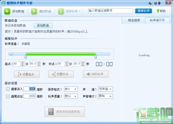 酷狗铃声制作专家一款精美的、免费的、易用的、傻瓜的、绿色的手机铃声制作软件。酷狗铃声制作专家提取自酷狗音乐2010中的一个组件,屏蔽界面广告,只需通过简单几步就能制作出一首与众不同的属于自己专家级别的手机铃声!酷狗铃声制作专家不仅支持铃声制作淡入淡出的效果,而且还可以制作增大铃声等等,而且使用上灰常的简单!