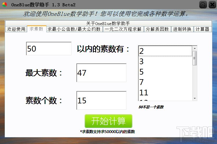 OneBlue数学助手是一款可以帮助你快速地完成一些简单数学运算的软件。OneBlue数学助手可以求素数、求最小公倍数、求比较大公约数、解一元二次方程和分解质因数等等。只要你有了这个软件,很多问题都可以迎刃而解,如果在遇到一些问题时可以用OneBlue数学助手计算出来。