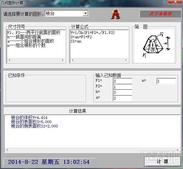 几何图形计算绿色版是一款可以计算几何图形的面积和体积的工具,可计算的图形有长方体、交叉圆柱体、棱台、棱锥、球、球带体、球缺、球扇形、三棱柱、梯形体、桶形、椭球形、斜截直园柱、园台、园柱和空心园柱、圆环体、直园锥。在几何图形计算软件中,只要在最上方选择几何图形,然后就会显示计算公式,然后输入数据,计算就会得到结果,非常实用。