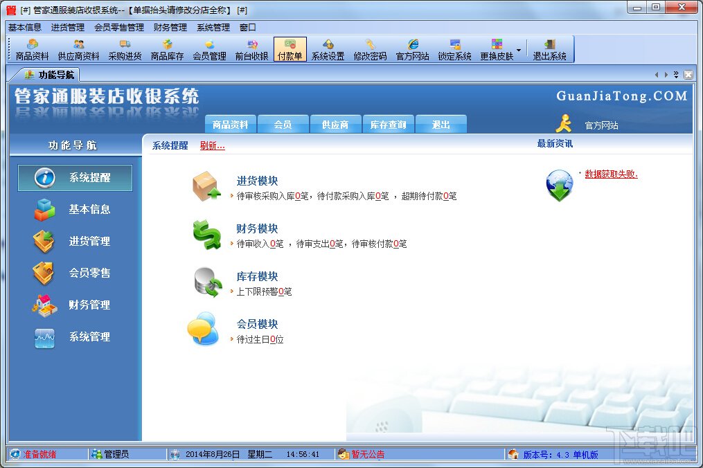 管家通服装店收银系统是专门针对服装店,内衣,鞋帽店而设计的收银软件, 是一款具备有市场潜力的服装收银软件,结构明晰,操作简单,对店铺商品的进销存能很好地管理,让你的经营帐目清清楚楚。管家通服装收银系统独创的颜色尺码处理技术,可以轻松应对各种颜色尺码。