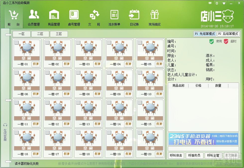 店小三自助餐软件是一款优秀专业的可以基本满足中小型餐饮行业,软件结构清晰,具有简单实用、快速上手的特点,操作人员一般不用培训就能使用该软件。界面美观,操作简单。含库存管理、发送邮件给老板、抽奖、等实用功能。