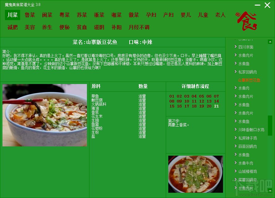 魔鬼美食菜谱大全包含八大菜系菜谱,包含孕妇,产妇,婴儿,儿童,老人等特殊人群的菜谱,也包含减肥,美容,养生,便秘,贫血,滋阴,补阳,月经不调等各种食疗菜谱。是大厨必备之神器!