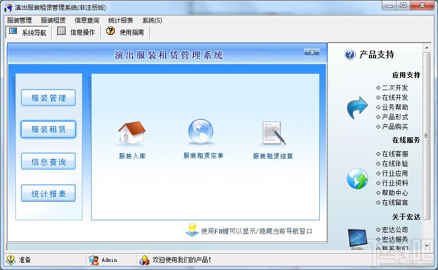 宏达演出服装租赁管理系统是一款优秀专业的针对演出服装租凭管理的软件系统,宏达演出服装租赁管理系统主要实现了对演出服装的入库管理,定单租赁以及租赁结算的管理,也可以快捷的查询各种服装信息和租赁的金额并且可以对数据进行汇总和分析.