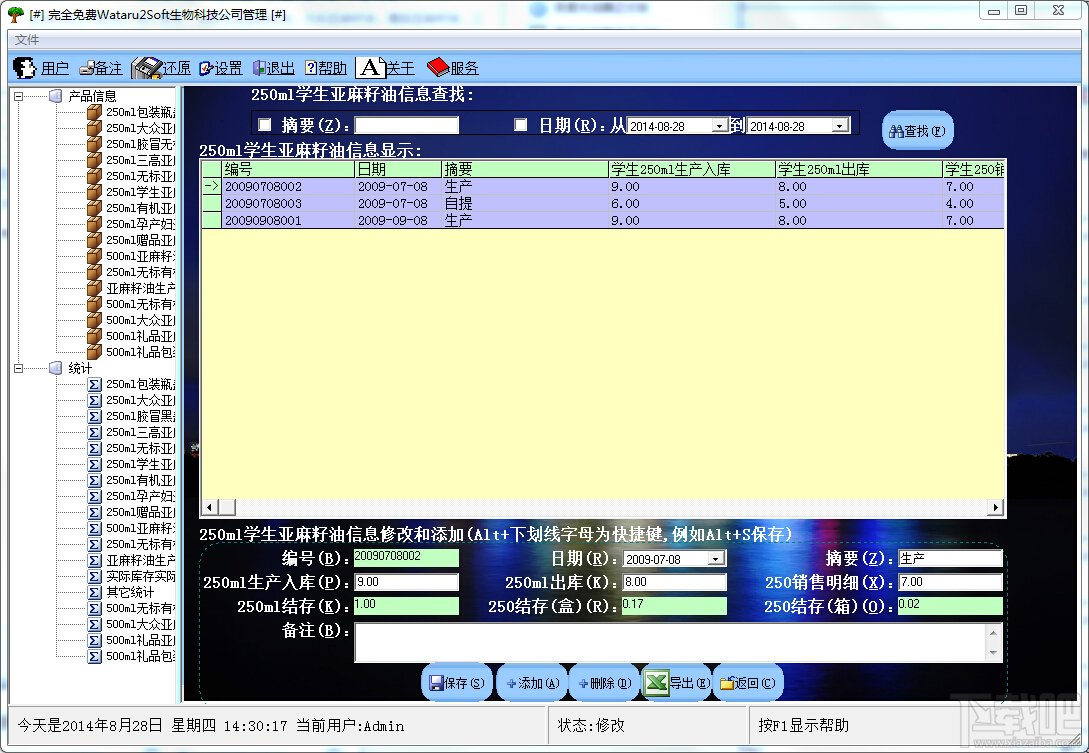 生物科技公司管理统计系统易学易用,操作简单,功能齐全,包括学生亚麻籽油,无标亚麻籽油,赠品亚麻籽油,三高亚麻籽油等等.