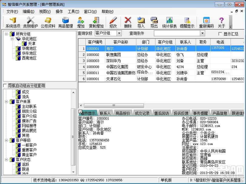 软件全面详尽的客户资料及联系人信息管理,支持多联系人.
