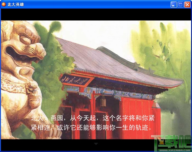 这个名为“北大英雄”的小游戏,在以北京大学校门为背景的幻灯片上,两行字映入眼帘:“北大、燕园,从今天起,这个名字将和你紧紧相连,或许它还能够影响你一生的轨迹。” 在展示了北京大学“春来鸟语花香,夏日荷叶满塘,秋后银杏纷飞,冬至满园银装”等如画风景后,游戏开始了。