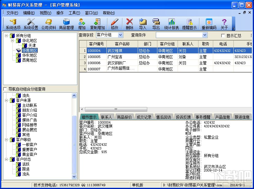11.2 MB/2020-08-17财易客户管理软件官方版是一款专业的客户关系管理软件(CRM管理系统),软件以客户为中心,把科学的管理与信息技术结合起来,实现市场、销售、服务协同工作统一管理。财易客户管理软件官方版功能:客户分组设置:进入软件后,左上角可以设置客户分组,可以设置多层结构分组。可以设置每个分组的查看权限,让每个用户只看到自己的客户记录。管理员可以查看所有客户记录。客户资料的维护:客户等级设置、自定义输入表单:根据自己