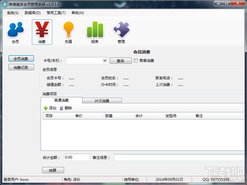 会员消费:添加消费,包括会员消费和散客消费,普通消费以及计次消费,自动计算剩余次数,支持快速查找会员!
