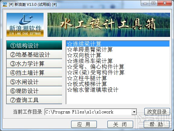 水工设计工具箱是一款优秀专业的水工设计工具箱,水工设计工具箱适用于结构工作,可以计算连续梁,双向板的计算,简支吊车梁的计算,弹性地基框架的计算,水工设计工具箱可以用于基础工程,可以计算搅拌桩承载力,计算单桩水平力,水工设计工具箱可以用于水利计算,计算风浪爬坡,宽顶堰水力的计算,水能计算,棱柱体水面线计算,导流明渠水力的计算,计算水闸调控水力计算,水工设计工具箱也可以用于挡土墙工程,计算重力式挡土墙,计算半重力式挡土墙,衡重式挡土墙,悬臂式挡土墙,扶壁式挡土墙,板桩的计算.