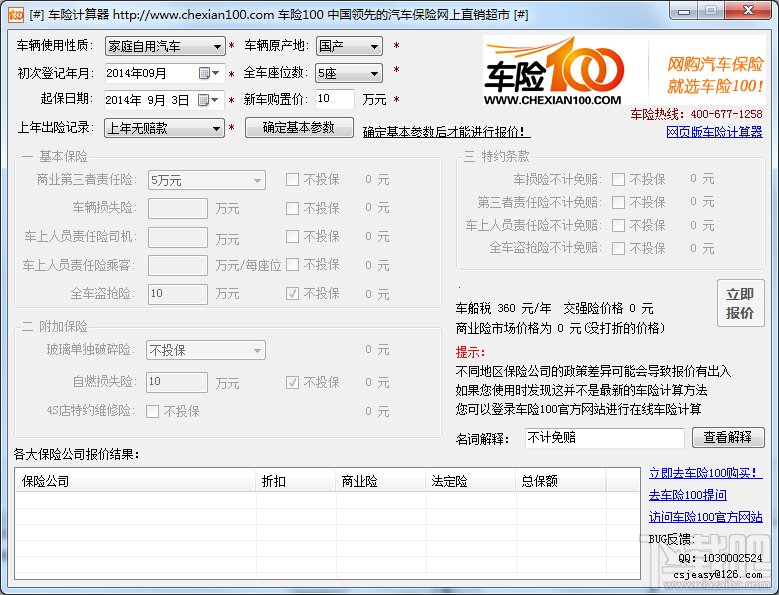 车险100车险计算器是一款优秀专业的实用性很强的车险计算工具。车险100车险计算器集成了新的车险计算公式,能轻松计算中国平安保险公司,人寿保险公司等10多家保险公司的车险报价。车险100车险计算器能计算各项保险的价格,让车主能更轻松的得到最实惠的车险报价方式,由于车险价格受各地保险政策和时期的影响,若因此导致车险报价结果有差异,请直接登录到车险100官方网站进行在线车险计算。