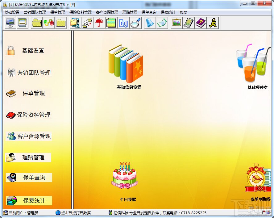 中天亿信综合保险代理管理系统是一款优秀专业的综合保险代理管理系统,是专门根据综合保险代理管理业务开发的一款软件,本系统主要包括如下功能:一:基础设置 (1:基础信息设置 2:基础项种类 3:提醒 1:生日提醒 2:保单到期提醒) 二:营销团队管理 (1:在职人员信息 2:离职人员信息 3:团队成员信息录入 4:公司人员查询) 三:保单管理 (1:车辆保险录入 2:财险录入 3:货运保险 4:寿险录入) 四:保险资料管理 (1:寿险资料 2:财险资料 3:车险资料) 五:客户资源管理 ( 1:财险客户信息 2:寿险客户信息 3:车险客户信息) 六:理赔管理 ( 1:理赔录入 2:理赔查询 3:理赔统计) 七:保单查询 (1:财险信息查询 2:寿险信息查询 3:车险信息查询) 八:保费统计 (1:寿险、财险统计 1:保费按归口部门统计 2:保费按经办人统计 2:车险统计 1:保费按归口部门统计 2:保费按经办人统计)