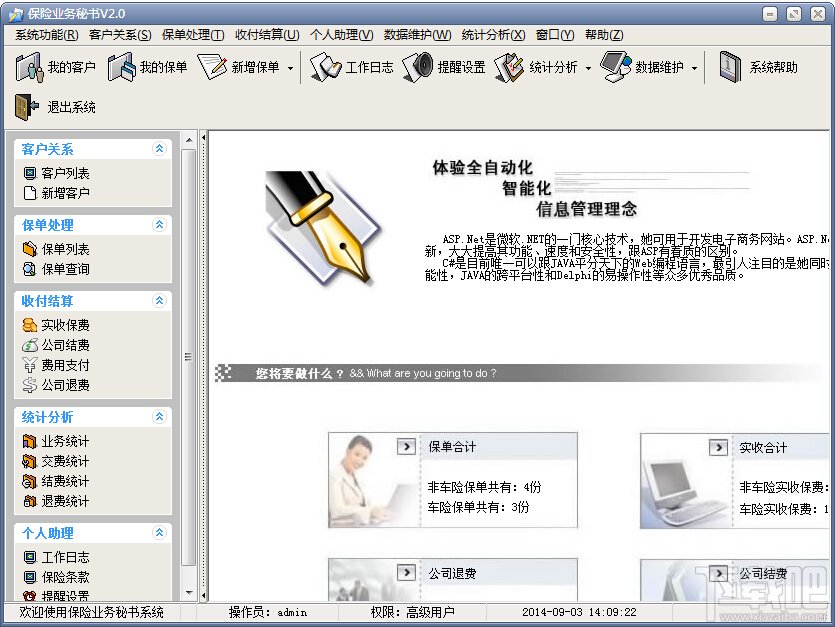 财产保险业务管理系统是一款优秀专业的针对于保险业务而开发的一款专业软件,财产保险业务管理系统具备客户管理,保单管理,佣金计算管理,团队管理,客户生日提醒,续期收费提醒,险种代码及保险责任查询,保险业务秘书可以按姓名,电话号码和保单号码进行知能查询客户的相关信息,以及保单信息,数据安全备份等助您从现在的客户中可以筛选出潜力客户从而提高拜访效果,财产保险业务管理系统界面友好,易学易用,操作简单,是一款很专业的行业保险软件。