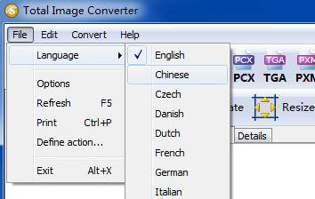 Total Image Converter(万能图片转换工具)设置中文的方法:点击菜单中的"file",然后点击"language",选择"chinese",即可。