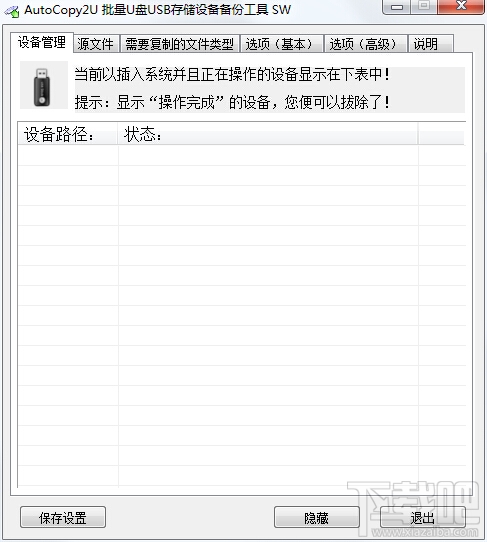 AutoCopy2U绿色版是一款批量全自动的USB存储设备拷贝/备份工具,可以实现将电脑中或者其他存储设备中的指定的文件数据,全自动原样的拷贝/备份到新插入的USB移动存储设备中。与其他软件工具不同的是,本软件不但支持设备的自动检测、自动操作,还支持几乎无限设备的同时批量操作、批量处理,满足多设备操作的高效率、高稳定性要求,实现工厂化批量生产。同时本软件还具备从设备自动格式化、文件复制CRC校验确保完整性、安全性等一键式、一条龙式的全自主处理,完全可以做到无需任何人工干预的全自动运行!