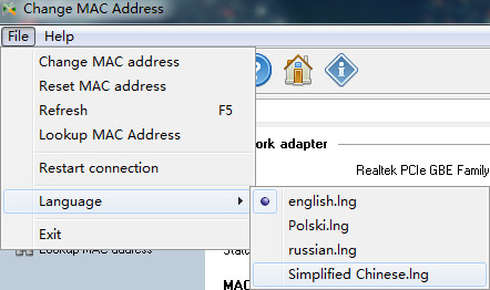 Change MAC Address(修改mac地址工具)设置中文的方法:在菜单栏上,点击“File”,选择“Language”,然后选择“Simplified Chinese.lng”,即可。