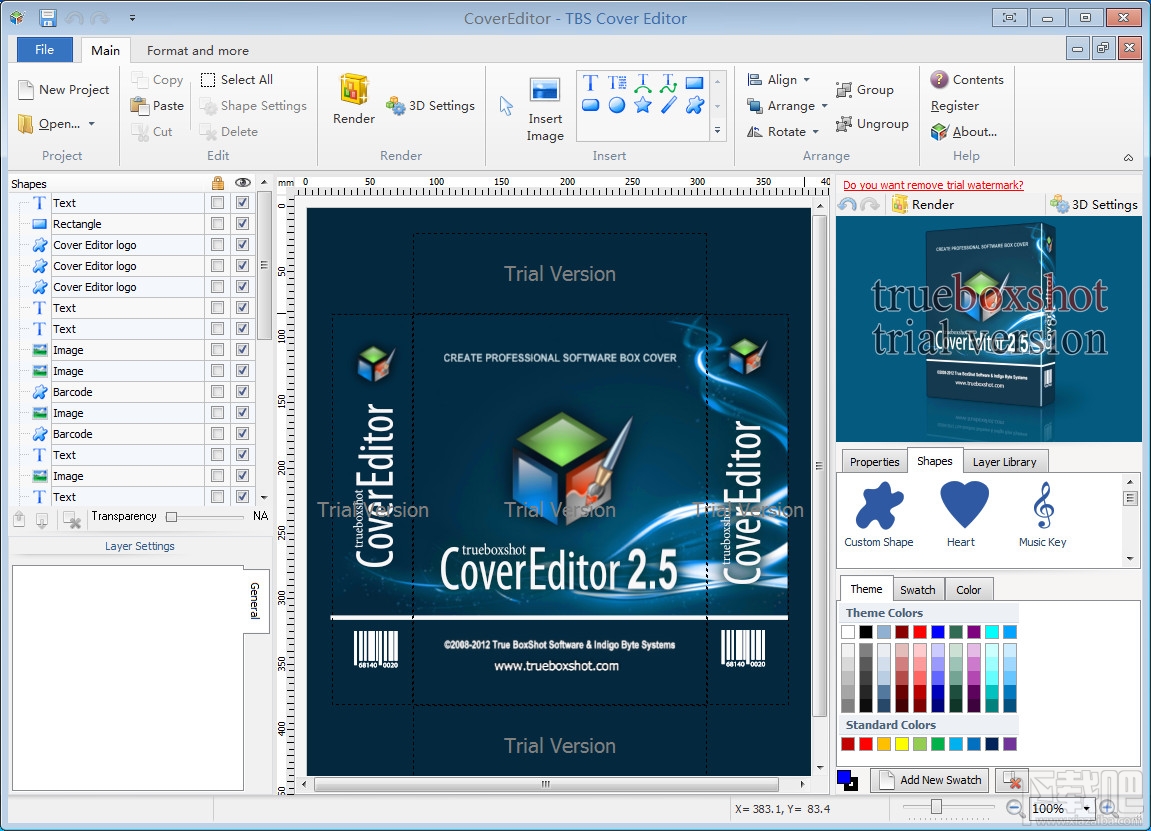 TBS Cover Editor(包装设计软件)是一个简单的工具来创建高质量的3D拍摄盒,DVD盒,CD封面,名片,小玩意,纪念品,或书的封面拍摄为您的软件,电影,音乐,电子书,或其它产品。TBS Cover Editor(包装设计软件) 提供内容广泛的免费的专业设计中拍摄,CD,DVD和书籍封面模板集合。TBS封面编辑器提供了一个巨大集合的预置框和拍封面模板。选择合适的模板,轻松上手使用新准备使用的封面设计。