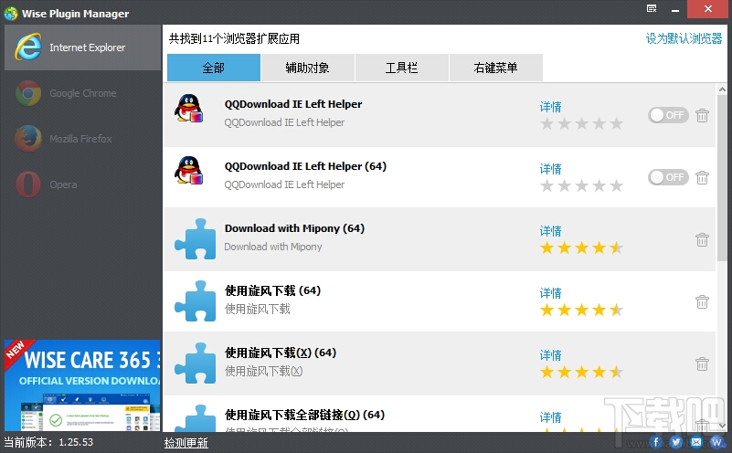 Wise Plugin Manager是一种有效的软件用于开启/关闭或删除浏览器插件,插件和扩展工具栏,它适用于Google Chrome,Internet Explorer,Mozilla Firefox和Opera。开启 Wise Plugin Manager 软件主窗口后,先从左边点选你要处理的浏览器,右边窗口会列出全部已被安装的插件程序、扩充套件或工具条等等项目,点一下 ON/OFF 开关便可启动或关闭该功能,点一下右边的垃圾桶图示便可删除该功能。