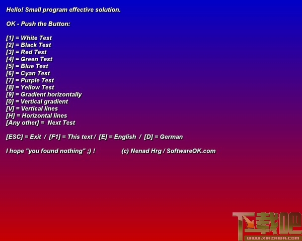31 KB/2020-08-17IsMyLcdOK是一个检测液晶显示器是否存在坏点的小程序。IsMyLcdOK软件体积非常小,可以不需要安装直接运行,也不需要其它运行环境。按0-9执行检测,或者按任意键依次进行检测