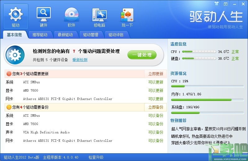 驱动人生2012支持32位和64位Windows 2003、Windows XP、Vista以及windows 7操作系统下的智能硬件检测及驱动程序升级功能。为了确保驱动人生在线智能检测、升级功能可正常使用,您需要确认您的计算机具备正常的互联网连接能力。软件运行后会自动检测电脑的驱动问题,并且可以对驱动的安装、更新、备份等问题进行一键处理。