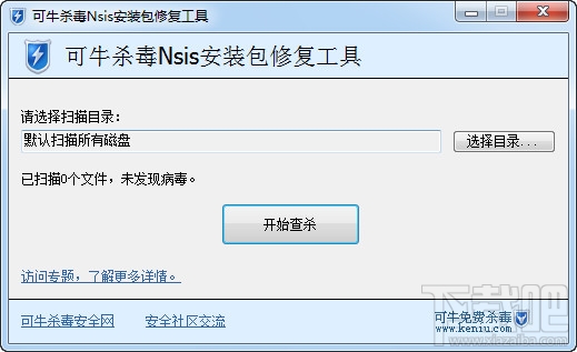 可牛杀毒NSIS安装包修复工具是一款可以修复NSIS安装包出现nsis error错误的软件。下载的游戏或软件安装包,运行时出现nsis error错误,可以尝试用可牛杀毒NSIS安装包修复工具进行修复。运行可牛杀毒NSIS安装包修复工具,选择安装包所在的目录,点击“开始查杀”即可查杀NSIS感染的病毒,并修复NSIS安装包。