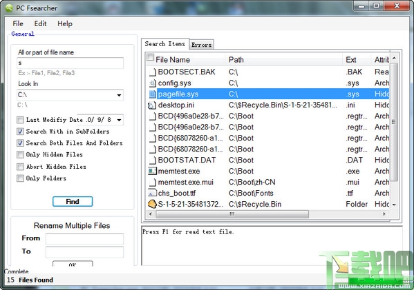 PC Fsearcher是一款易用的文件和文件夹搜索工具。你可以输入某个关键字或全名进行搜索,可以设置在某个盘符上搜索。支持根据修改时间搜索,在子目录搜索,只搜索隐藏文件等等功能。