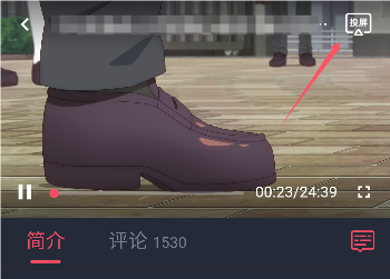 2、点击播放页面,右上角会出现【投屏】字样,点击进入。