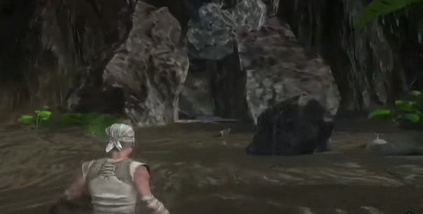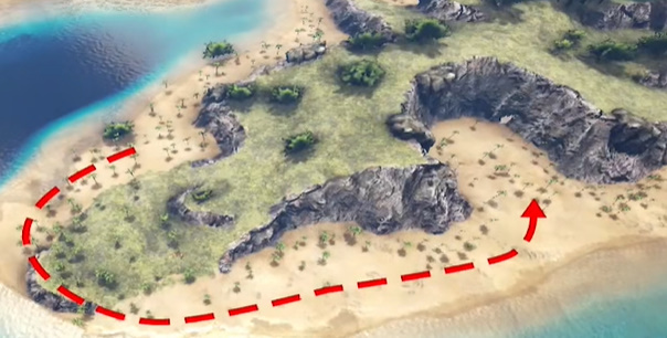 2、复活以后,按照下图路线,沿着海岸线找到一片凹进去的山谷。