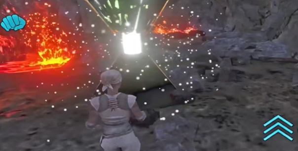 5、玩家需要全程举着地图,往里走遇到岔路往右走,断崖直接跳过去,最后就能来到神器位置。